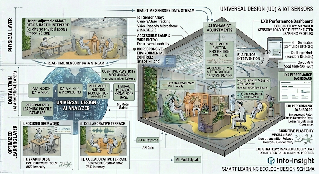 The 28th report of Info-Insight highlights the transformative power of Universal Design (UD) integrated with AI EdTech. By leveraging AI-driven assistive technologies, educational environments can now provide real-time, multimodal conversions for students with diverse physical and cognitive needs. From a Neuro-architectural standpoint, Digital Twin systems and Biophilic elements work together to mitigate sensory overload and foster an inclusive “safe zone.” This LXD strategy ensures that ergonomic interfaces adapt to the individual, shifting the focus from accommodating disabilities to empowering all learners through empathetic, data-driven design.